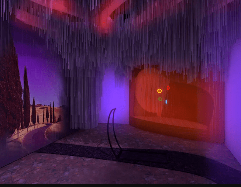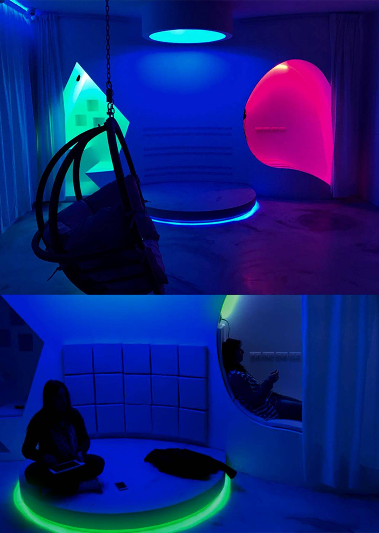 A lato dell’ingresso un i-pad permette di scegliere gli scenari in cui proiettarsi, poi vi è un enorme -video in cui immergersi, una pedana gigante da cui godere le vibrazioni della musica, cuscini strip strap, tende morbide che nascondono altre nicchie, di cui una sonora in cui ascoltare musica insieme a un massaggio ai piedi, mentre nell’altra si sperimentano stimolazioni di aromi, gusti e tattilità.
