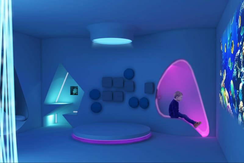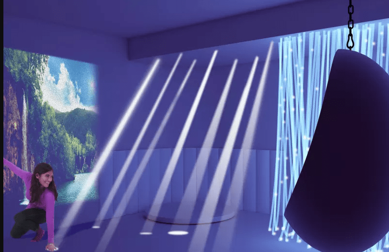 All’interno c’è una pedana rotante, un’altalena di tessuto, un cuscino avvolgente, due nicchie, fibre ottiche, un proiettore per foto e video, fasci di luce e oggetti sensoriali.