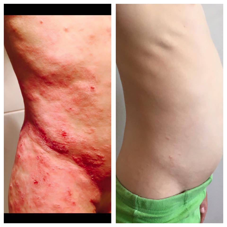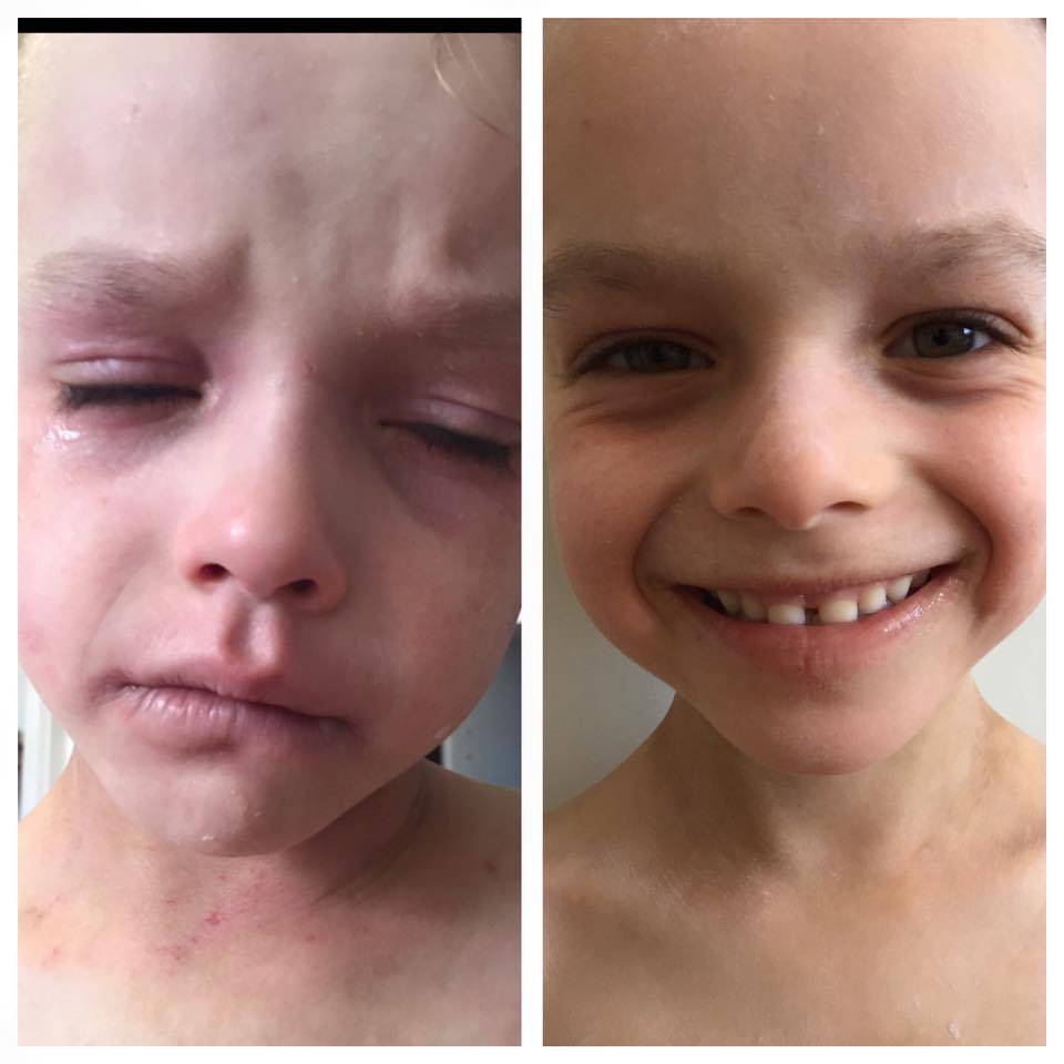 “La foto a sinistra è stata scattata nel novembre 2015, Tyler si sentiva davvero male. Così ho inviato una mail esternando le mie preoccupazioni al dottor Aron, che ha messo Tyler sotto trattamento intensivo per 8 giorni. Ho scattato la seconda foto quando il prurito è completamente scomparso. Il suo è un sorriso che celebra questo ometto forte e coraggioso”.