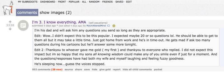 “Ho 3 anni e conosco qualsiasi cosa, chiedetemi quello che volete”: questo è stato il titolo della discussione con cui il padre del bimbo ha lanciato l’interazione mediata da lui tra il figlio e gli utenti di Reddit, assicurando che avrebbe fatto qualsiasi domanda arrivata al figlio, se appropriata.