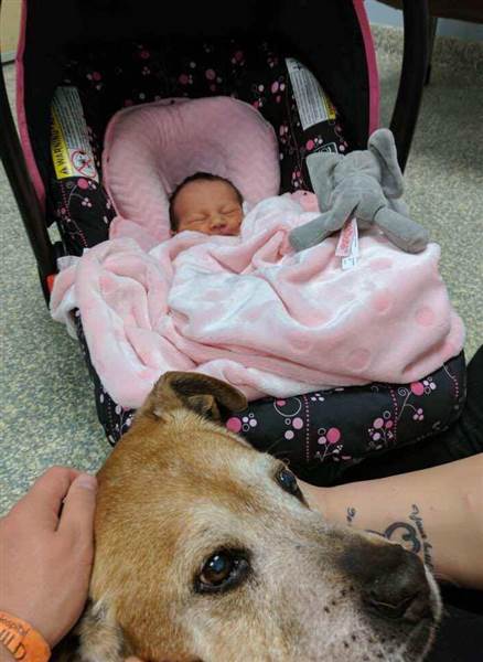 Dopo aver partorito, quando la coppia ha portato a casa Hazel il cane l’ha dapprima annusata e poi ha posato la testa vicino a lei: “era così bello che ho pianto”.