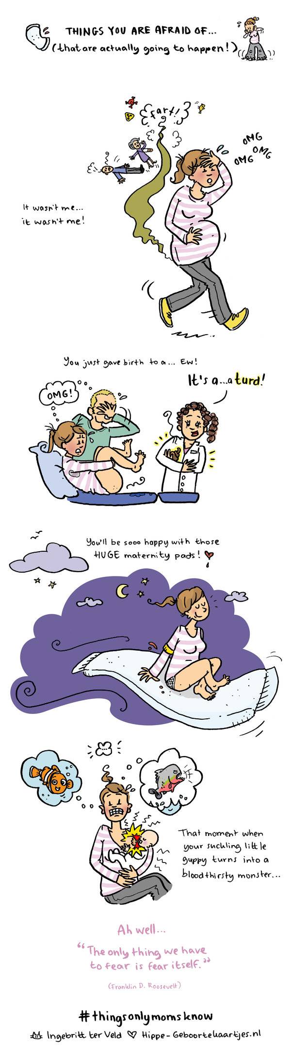 Quando de Vries ha incontrato ter Veld, l’artista era incinta di sua figlia Juun, che ora ha 6 mesi. Così sono rimaste in contatto e hanno parlato di “tutte le cose strane che avevamo sperimentato,” trasformando quelle situazioni in cartoni animati divertenti, visibili tutti sul loro sito.