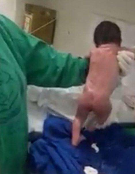 Poi si vede l’ostetrica sollevare la piccina per rimetterla nella posizione originale, la piccola si rifiuta e riprende a camminare sulla tavola neonatale.