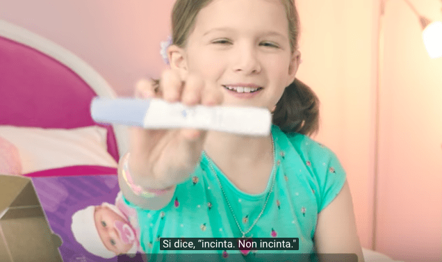 Una bambina apre la scatola di una bambola e trova un test di gravidanza: un messaggio contro le gravidanze giovanili