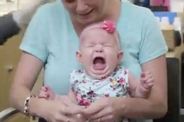 Il video mostra il bebè che piange e strilla mentre le fanno il piercing mentre la mamma cerca di consolarma mettendole un ciuccio in bocca.