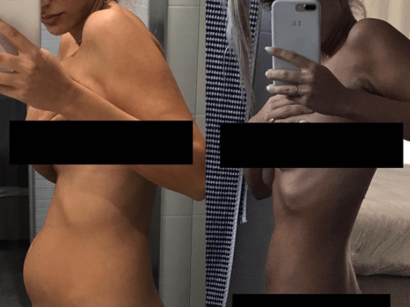 Sulla sinistra c’è il mio stomaco dopo la rottura di una cisti ovarica (5 settimane fa), quella a destra sono io, ora, sotto farmaco chiamato “synarel” che ha fermato tutti i miei ormoni e mi ha mandato in menopausa all’età di 27 anni.