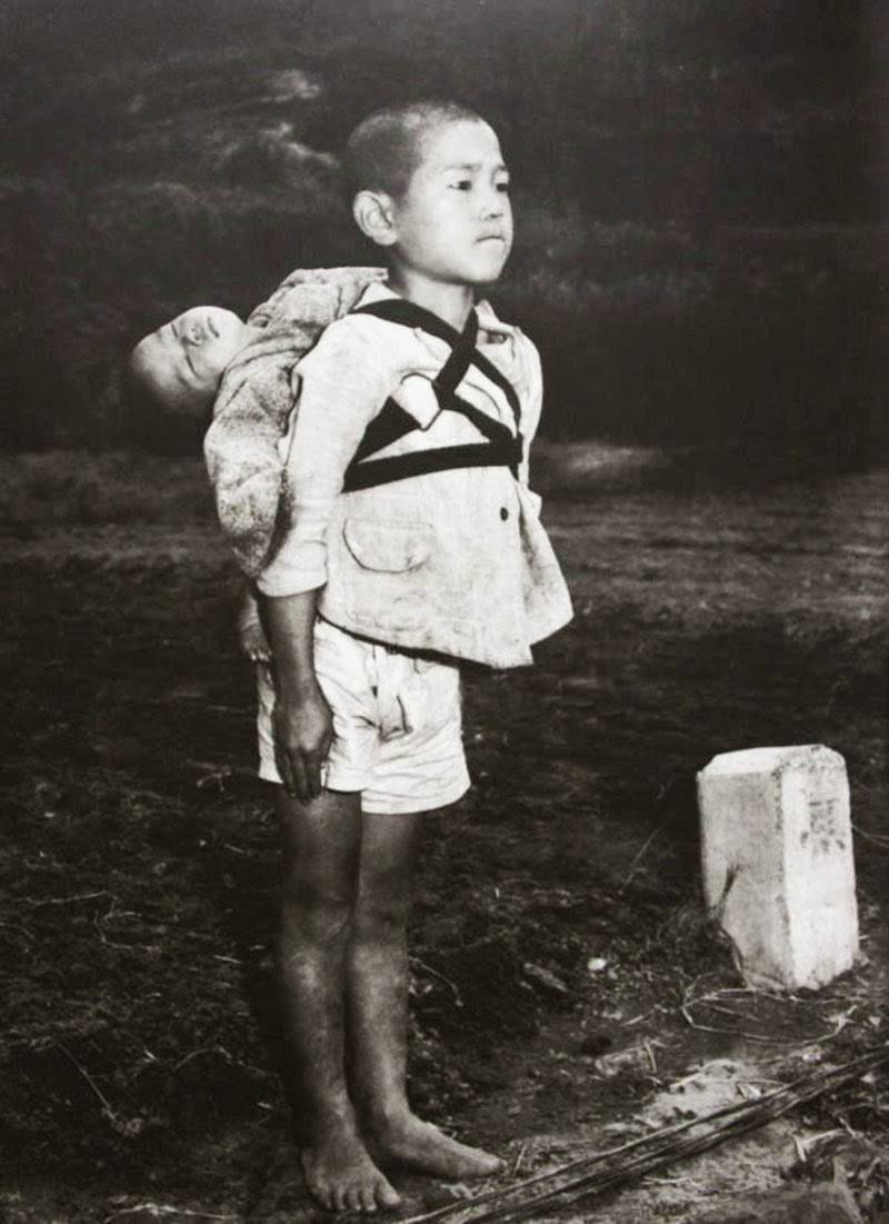 La foto è stata scattata a Nagasaki dopo l’esplosione della bomba atomica e ritrae due bambini, uno in piedi, rigido quasi sull’attenti, e l’altro più piccolo legato alle spalle del primo, abbandonato come se dormisse. Il bambino più piccolo però è morto nel bombardamento. Il fratello lo porta sulle spalle in attesa che venga cremato.