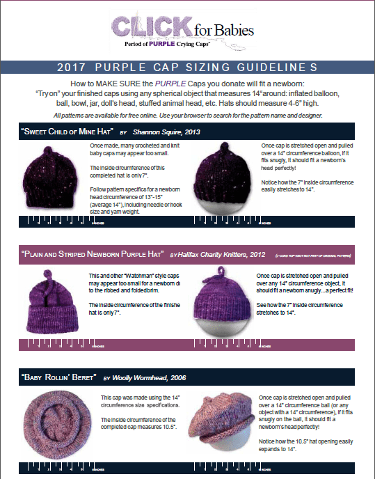 Il Dipartimento di Salute dello Stato dell’Oklahoma ha invitato tutti a realizzare a maglia delle cuffiette per neonati di colore viola. Si chiama “Click Campaign” (Campagna Click) e il nome viene dal rumore che fanno i ferri quando si lavora a maglia. I cappellini o le cuffiette di maglia o cotone sono molto importanti, perché mantengono la testa dei neonati al caldo, evitando dispersioni di calore.