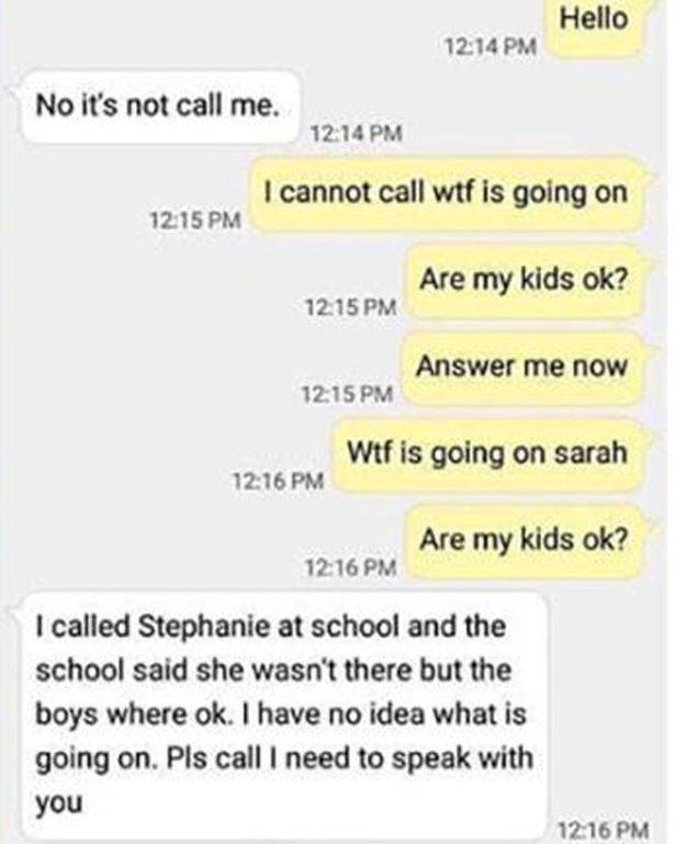 Sarah: ho chiamato Stephanie a scuola e mi ha detto che lei non era lì ma che i ragazzi stavano bene. Non so cosa stia succedendo, per favore chiamami, ho bisogno di parlare con te.
