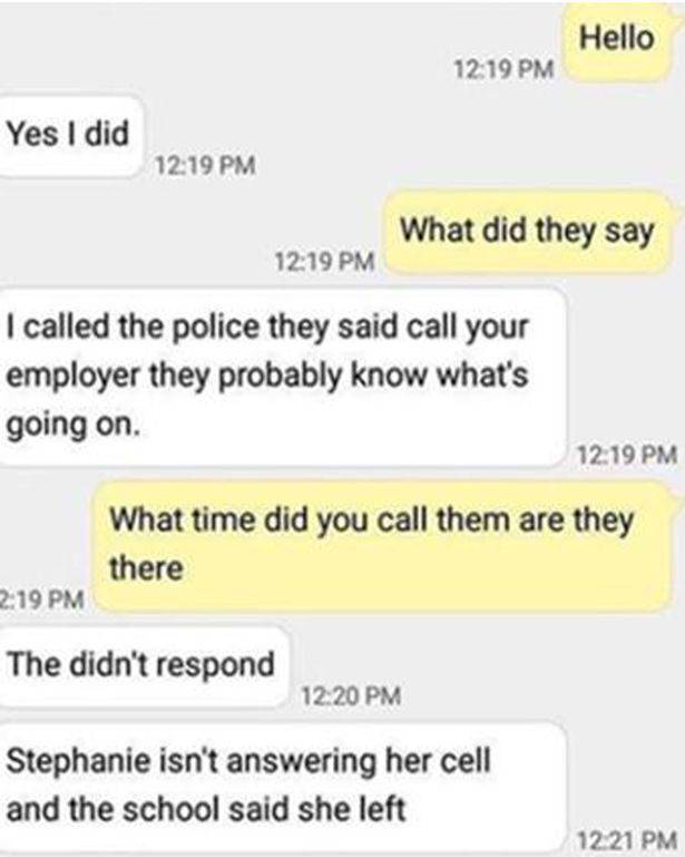 Sarah: non hanno risposto. Stephanie non risponde al telefono e a scuola mi hanno detto che se c’è andata.