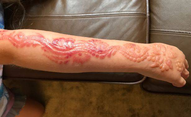 Poco dopo essere tornata a casa la bimba ha cominciato a lamentarsi del disegno che partiva da un dito fino ad arrivare al gomito. Il tatuaggio le prudeva.