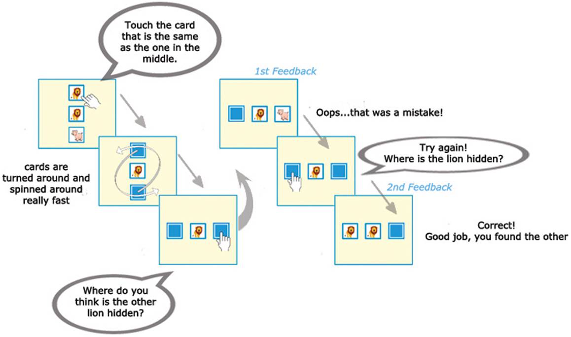 Gli scienziati hanno dato ai bambini un gioco che rappresentava degli animali su alcune carte con cui giocare su un tablet. L’obiettivo era quello di associare la carta con quella mostrata nel mezzo dello schermo, come si vede nella figura in basso.