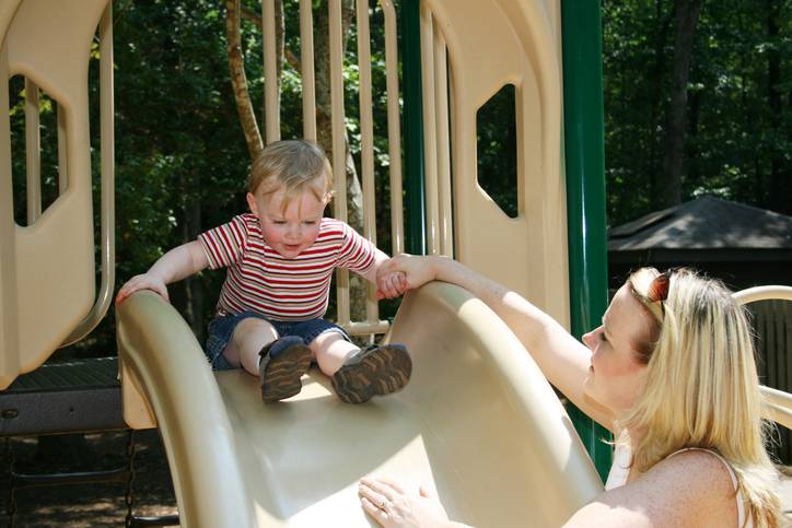 I bambini anche di un anno possono incominciare a scendere da soli sullo scivolo, anche se è molto più comune che i genitori scendano con i bambini, con il risultato che i bambini sono più in pericolo di quanto potrebbero essere. .