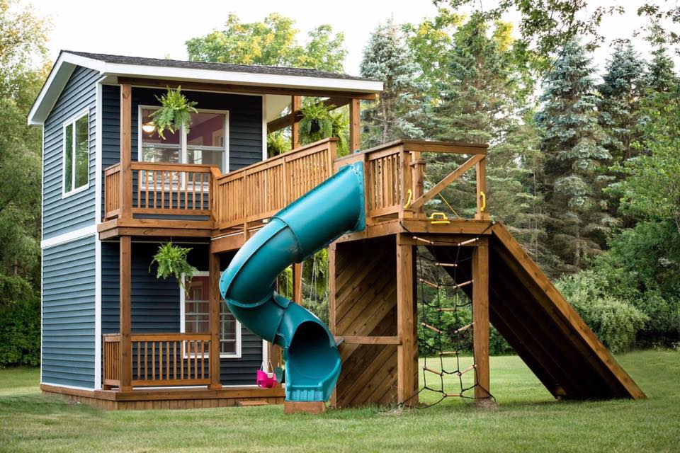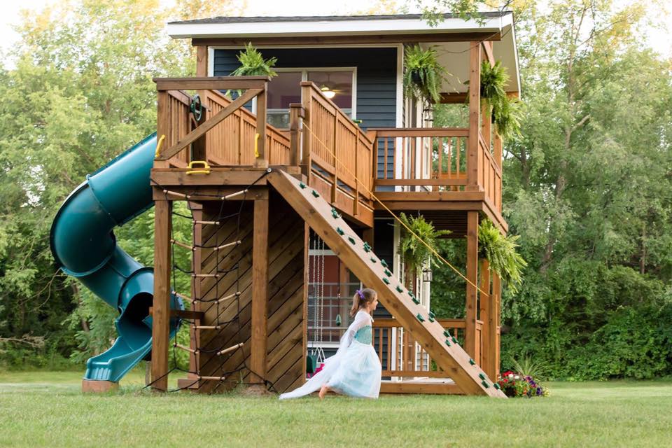 Come potete notare osservando le immagini, si tratta di una deliziosa costruzione a 2 piani, con scale e due portici, cesti di piante sono appesi all’esterno e c’è persino un ponte che collega l’abitazione alla zona gioco fornita di scivolo, reti per arrampicarsi e altalene.