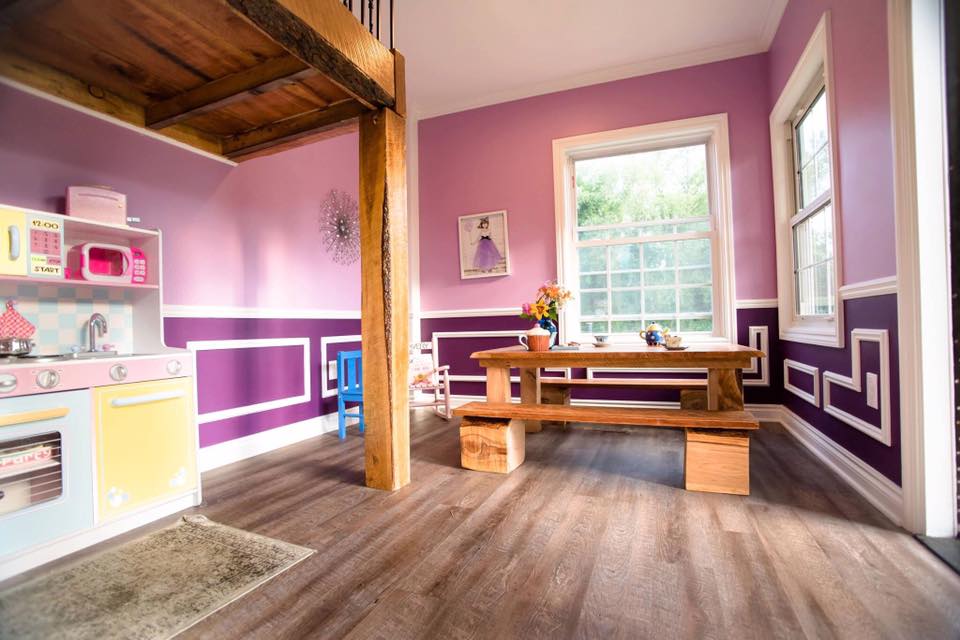 Anche gli interni dell’abitato sono spettacolari, per le pareti il papà ha scelto una tonalità porpora, mentre gli arredi sono in legno, come l’esterno.