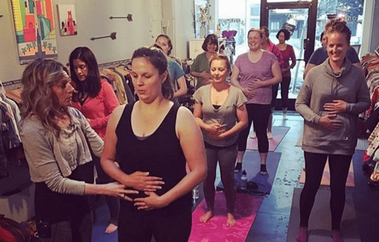 Ci si siede sul pavimento con le gambe incrociate, le mani sul ventre, si deve prendere un grosso respiro. “Lasciate che il vostro addome si espanda” spiega.