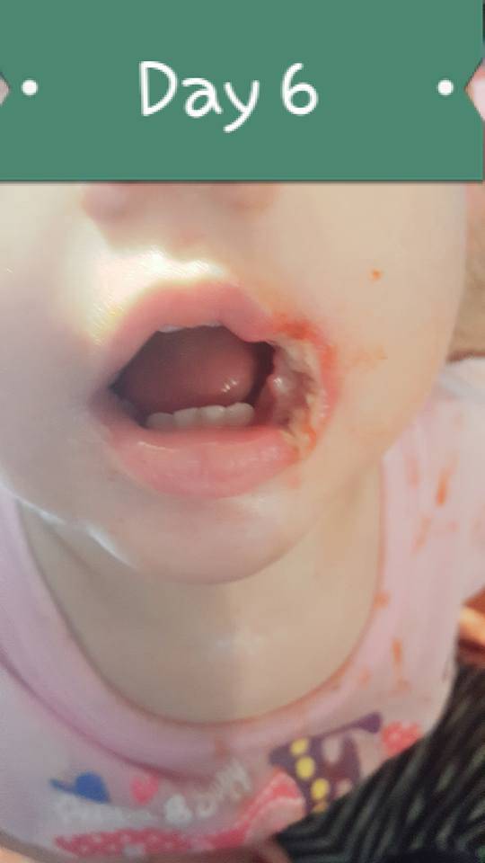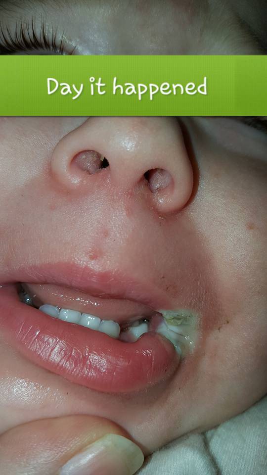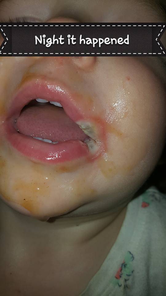 Il 28 settembre la mia piccola di 19 mesi si è messa il mio caricabatterie in bocca. Siamo andati subito dal dottore che ci ha confermato che si trattava di una bruciatura elettrica anche se non c’era niente che si potesse fare perché lei l’avrebbe leccato.