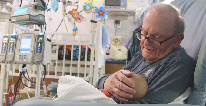 Nonno David è già diventato una piccola star: il video in cui accarezza un neonato è già diventato virale, così come la foto postata sulla pagina Facebook dell’ospedale cittadino, in cui l’uomo tiene tra le braccia il piccolo Logan di 25 settimane. In poche ore la foto è stata condivisa più di 160mila volte.