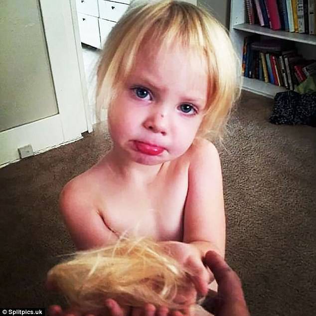 bimba che finge di pentirsi porgendo una ciocca di capelli alla mamma.