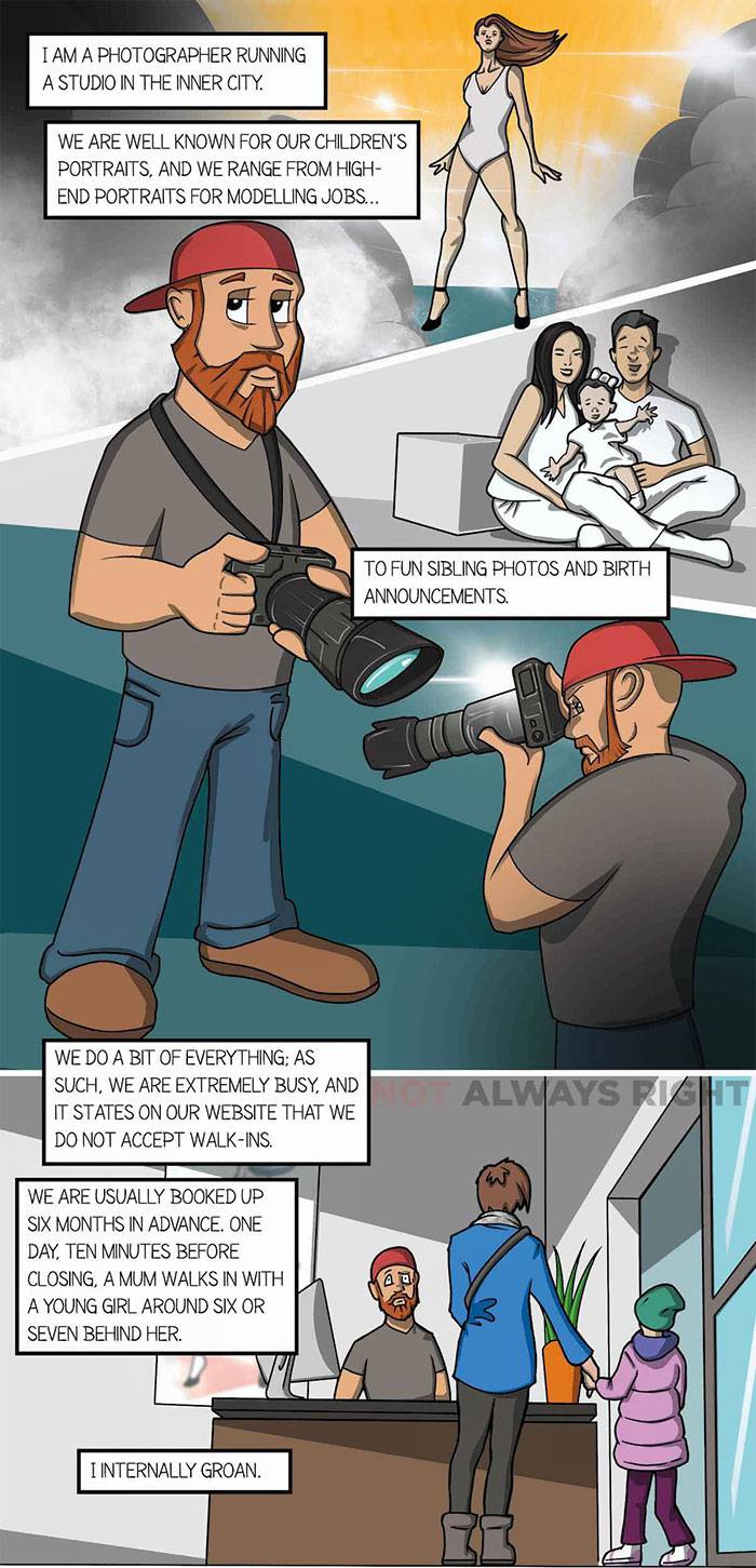 Un importante studio fotografico di Melbourne è specializzato in ritratti con bambini e famiglie, oltre a servizi fotografici con modelle. Sono molto quotati e richiesti, tanto che è occorre prenotare un servizio con molti mesi in anticipo e non accettano richieste di chi si presenta in negozio. Occorre chiamare e prenotare. Tuttavia, una sera, mentre uno dei fotografi dello studio stava per chiudere, gli si presenta una mamma con una bambina di 6 o 7 anni.