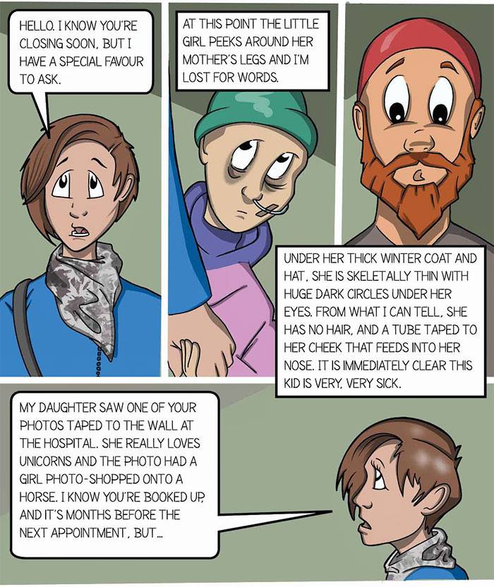 La madre, quasi in lacrime, spiega: “Mia figlia ha visto una delle vostre foto sul muro dell’ospedale. Lei adora gli unicorni e la foto aveva una ragazza photoshoppata su un cavallo. So che siete prenotati, e che ci vogliono mesi al prossimo appuntamento, ma…”