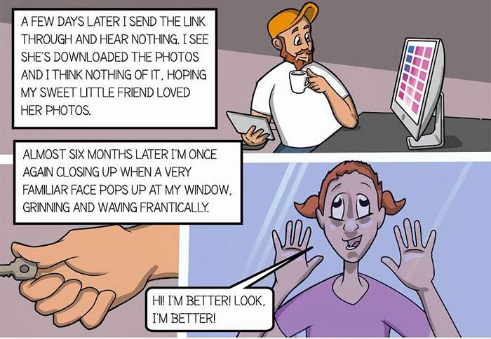 Pochi giorni dopo, il fotografo invia il link con le foto. Non riceve però nessuna risposta, ma vede che la foto sono state scaricate. Spera che le immagini siano piaciute alla sua piccola amica speciale.