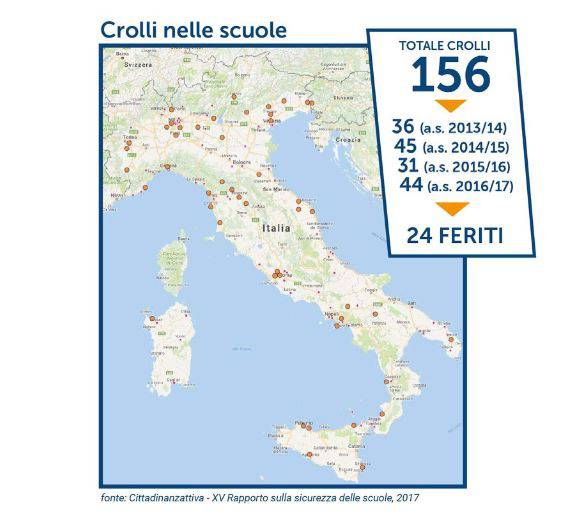 Solo nello scorso anno scolastico, riferisce Cittadinanza Attiva, si è avuta notizia tramite la stampa locale di 44 episodi di crolli, con feriti tra gli studenti ed il personale, oltre che danni alle cose e alle strutture. In alcuni casi, eventi annunciati e prevedibili, in altri totalmente inaspettati, in altri ancora non prevedibili. Si tratta di crolli di solai, tetti, controsoffitti, distacchi di intonaco, caduta di termosifoni, o alberi, che si verificano in modo indifferenziato nelle scuole del Nord e del Centro – Sud, negli istituti comprensivi come nelle scuole superiori, nei piccoli centri come nei grandi.