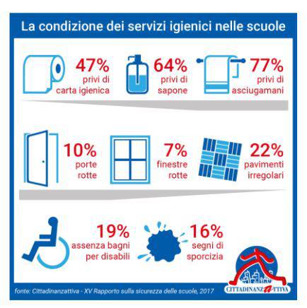 La metà dei bagni non ha carta igienica, nel 64% manca il sapone e nel 77% qualsiasi tipo di asciugamano. I pavimenti sono irregolari nel 22% dei servizi igienici, finestre e porte rotte rispettivamente nel 7% e nel 10% dei casi, segni di sporcizia nel 16% dei casi. Una scuola su cinque risulta priva di bagni per disabili.