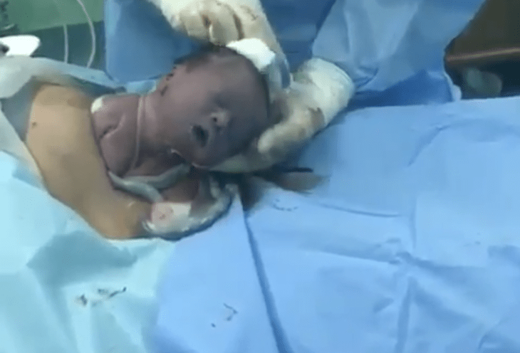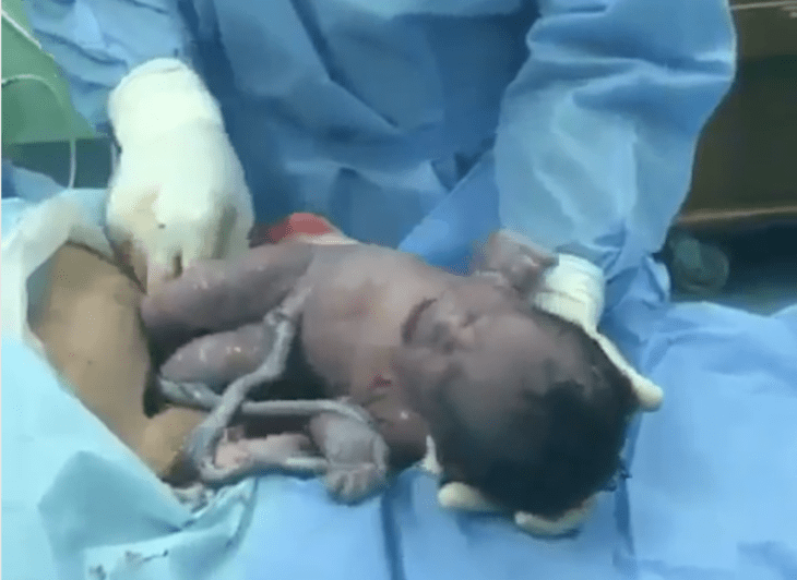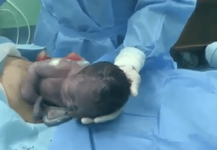 Nelle immagini vediamo il bimbo piangere e il medico porre una mano sotto la sua testa, mentre il neonato cerca di uscire.