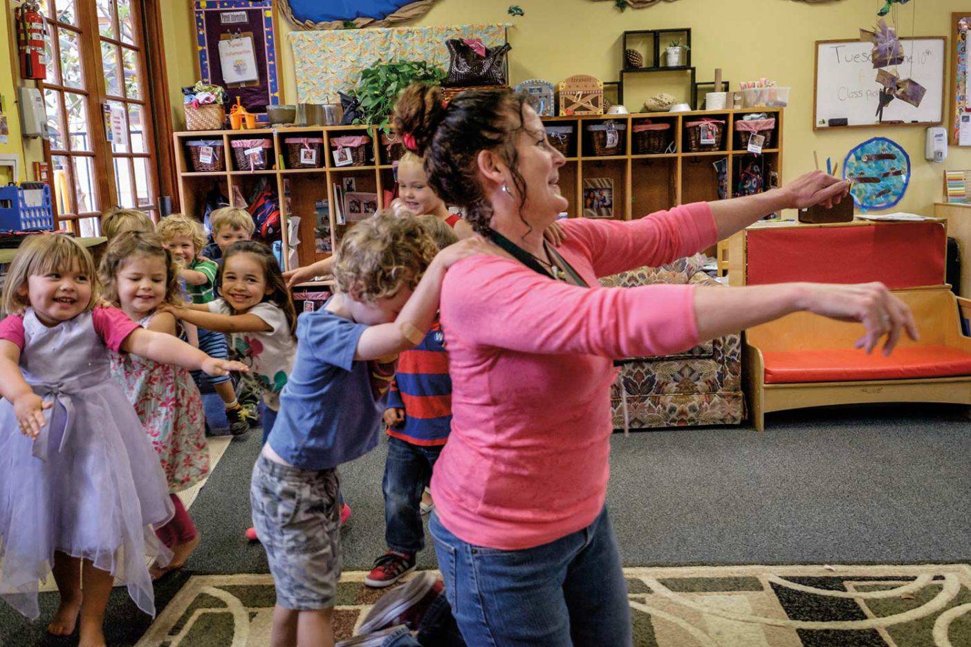 In questo asilo si propongono giochi per promuovere immaginazione e ragionamento astratto in modo che percepiscano spazio e taglia.