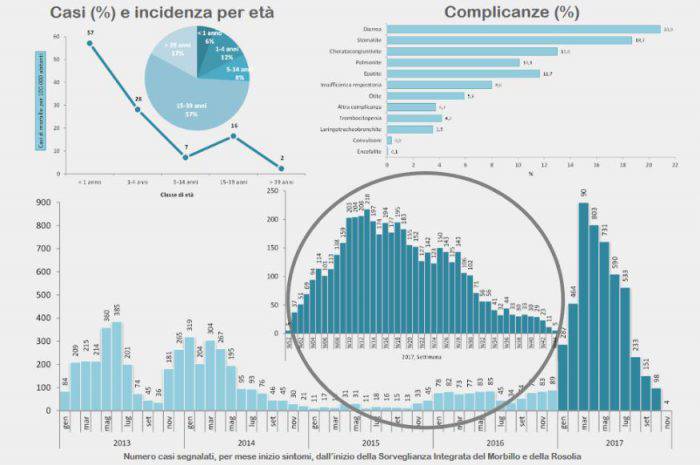 Il sistema di sorveglianza di Epicentro, portale di epidemiologia per la sanità pubblica, ha invece segnalato in questi giorni i casi di morbillo nel periodo compreso tra il 1° gennaio 2017 e il 5 novembre 2017, secondo il bollettino settimanale, istituito dopo a seguito dell’esplodere dell’epidemia.