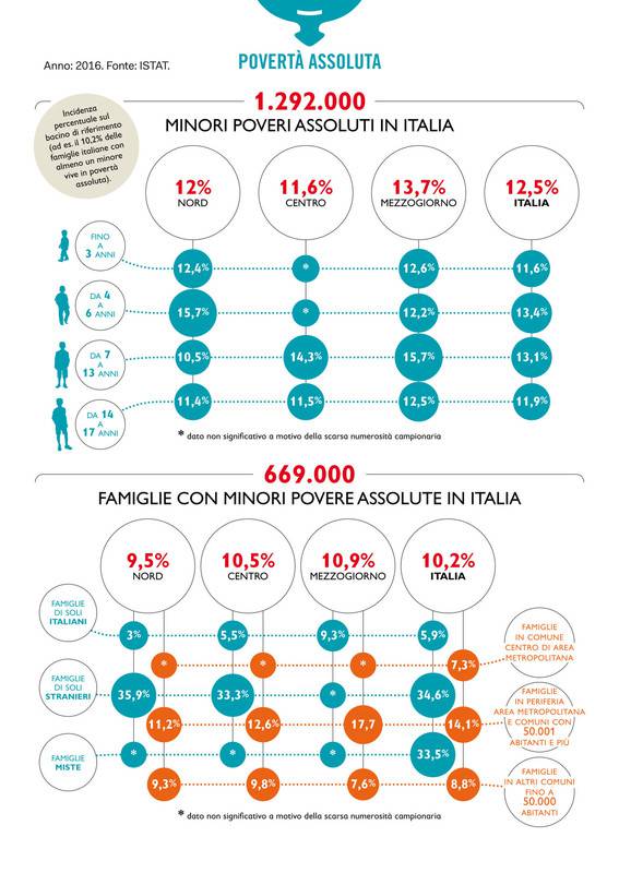 In Italia, riporta Save the Children, vivono 669mila famiglie con minori in condizione di povertà assoluta. Le famiglie povere una volta affrontate le spese fondamentali irrinunciabili, come quelle per la casa e la spesa alimentare, possono spendere solo 40 euro per la cultura e 7,60 per l’istruzione al mese. Il fenomeno riguarda tutta Italia e i bambini che si trovano in questa situazione sono il 12,5% del totale dei minori: