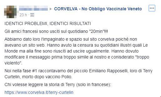 Così le foto in bianco e nero dei bambini presunti morti da vaccino con le didascalie di denuncia in bella evidenza sono finite su un giornale francese, mentre lo spazio sul web glielo ha dato Corvelva, molto più organizzata e strutturata dei francesi. La vicenda ha suscitato l’attenzione dei media e il caso è finito sul quotidiano francese Le Monde, che ha trattato direttamente la campagna di Corvelva giudicandola ingannevole.