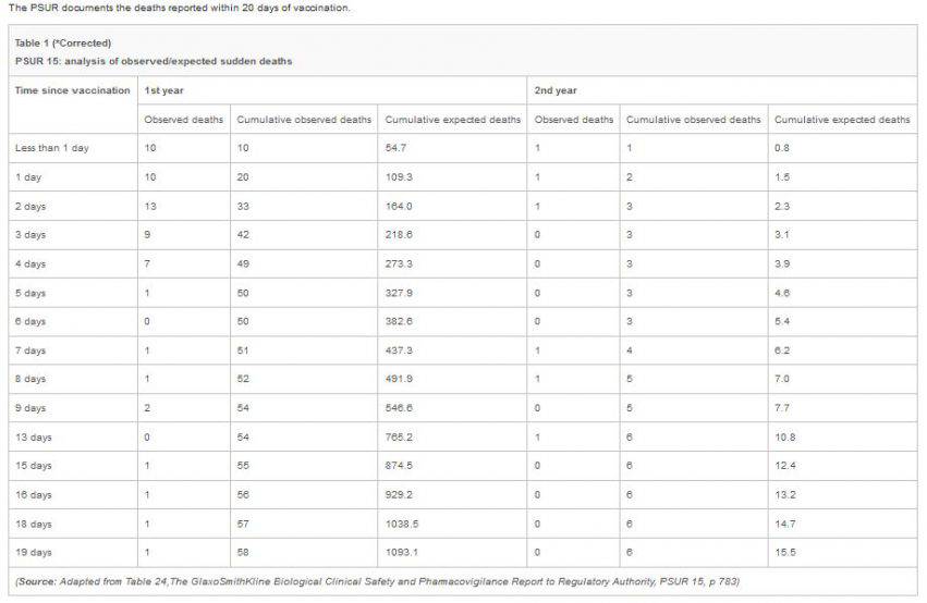 Secondo l’analisi, i medici hanno scoperto che l’ultima relazione sulla sicurezza del vaccino “Infanrix hexa” presentata da GSK (2015) ha cancellato i decessi riportati in precedenza dal produttore nel suo 16° rapporto (2012). Essi, tuttavia, notano che non è chiaro nella relazione come questi decessi siano stati cancellati.