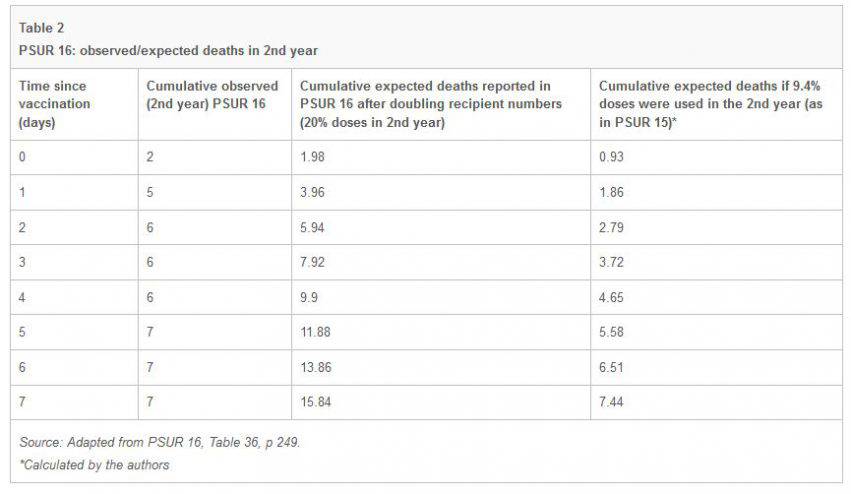 “Nella tabella (PSUR 16, sotto, ndr) ci sono anche dati stimati, calcolati dagli autori con un criterio personale (si può fare, nulla di male, viene dichiarato). Tenendo conto dell’incidenza storica della morte improvvisa in una popolazione formata da milioni di bambini, dopo 7 giorni dalla vaccinazione ci si dovrebbe aspettare un totale di 7,44 casi di SUD nel secondo anno di vita. Ce ne sono stati 7. Non mi sembra rilevante che ce ne siano state 2 il primo giorno e 3 il secondo, quindi una al quinto, oppure che magari ce ne sia una al giorno, o tutte al settimo. È chiaramente una distribuzione del tutto casuale con numeri troppo piccoli per consentire divagazioni statistiche. Per inciso, usando un altro metro di analisi, gli autori stimano in 15,84 il numero cumulativo di morti attese al 7° giorno (ce ne sono state sempre 7). È quindi ragionevole pensare che le morti improvvise avvenute nei primi giorni dopo la vaccinazione rispecchino quella che è la normale epidemiologia di questa drammatica patologia“.