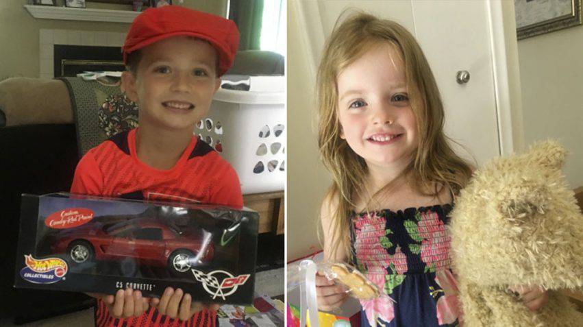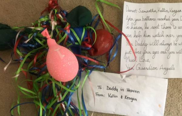 Ma non è finita qui. Marito e moglie hanno mandato a Samantha, Kollin e Kaegan e perfino al cane di famiglia un pacco pieno di regali, indagando prima quali regali potessero piacere ai due bambini. Nel pacco c’erano anche i palloncini con il messaggio, così che i bambini potessero pensare che era stato il loro papà, dal cielo, ad inviare questi doni.