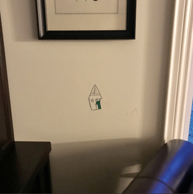 “Stavamo preparando i bambini per andare a scuola, come parte della loro routine durante la colazione loro fanno pratica a scrivere lettere, numeri, ecc… Io e mia moglie stavano preparando il pranzo dei ragazzi e gli zaini per portarli a scuola. Ci siamo distratti solo per pochi istanti e il nostro figlio maggiore ha deciso di insegnare al minore come disegnare una casa… usando la nostra parete e i suoi pastelli”.