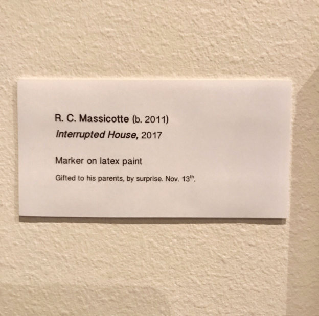 “Casa interrotta, 2017” è il nome dell’opera a cui segue l’autore: R.C. Massicotte b. 2011. C’è anche la descrizione: “pennarello su tela di latex, dono improvviso ai suoi genitori. 13 Novembre”.