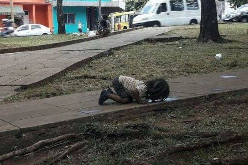 Una bimba di 3 o 4 anni è stata fotografata mentre beveva da una pozzanghera in Argentina.