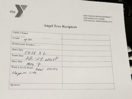 Ospitiamo un “Angel Tree” (albero degli angeli) ogni anno e ho scelto casualmente una lettera.
