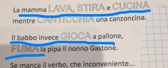 Un libro delle elementari è sotto accusa perché riporta delle frasi che effettivamente non fanno fare bella figura alle donne. Nel testo I verbi canterini edito da MelaMusic si legge infatti: “La mamma lava, stira, cucina mentre canticchia una canzoncina. Il babbo invece gioca a pallone, fuma la pipa il nonno Gastone”.