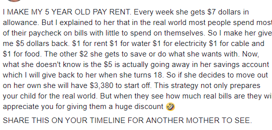 “Ho costretto mia figlia di 5 anni a pagare l’affitto. Ogni settimana lei riceve 7 dollari di paghetta.