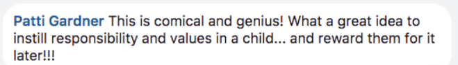 “Questo è divertente e geniale! Che bella idea per instillare responsabilità e valori in un bambino e ricompensarlo per questo dopo.”