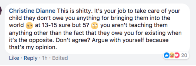 “Questo fa schifo, è il tuo lavoro prenderti cura di tua figlia, lei non ti deve niente per averla portata in questo mondo. A 13-15 ma sei sicura a 5? Non le stai insegnando nient’altro che il fatto che ti è in debito per l’esistenza quando in realtà è l’opposto. Non sei d’accordo? Litiga con te stessa perché questa è la mia opinione”.