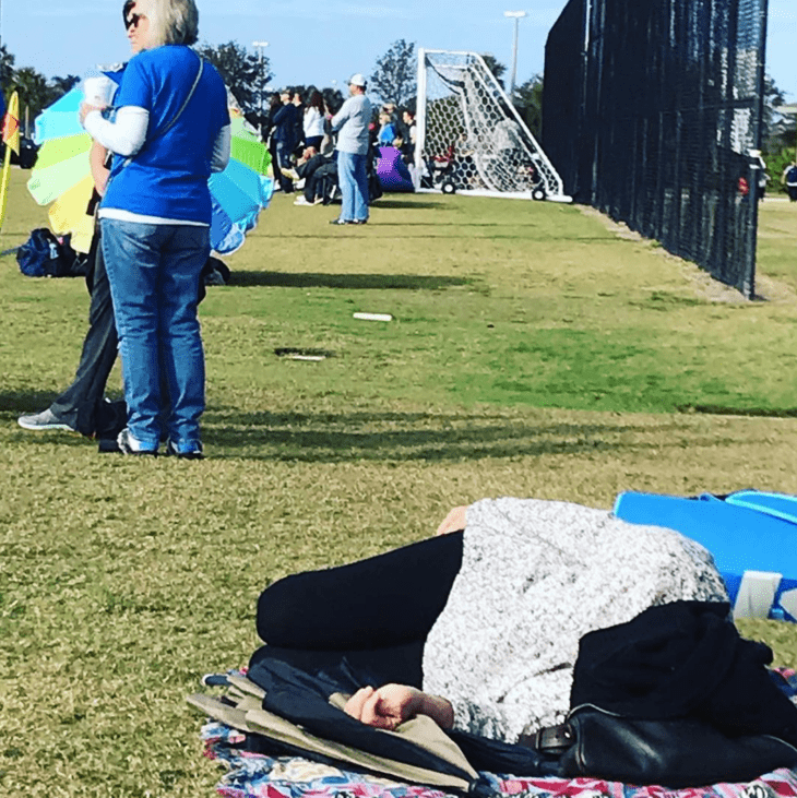 Mentre tutte le altre mamme sono rimaste sul bordocampo con grande preoccupazione, questa eroina è rimasta con il suo corpo stesa a terra, la testa appoggiata sulla borsetta, la giacca sul volto e ha fatto un pisolino.