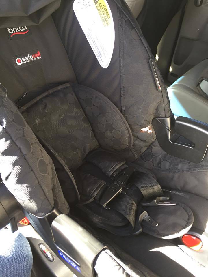 “Solo io! Questo è successo oggi. Un seggiolino Britax e uno specchio Eddie Baurer. Grazie Signore! Stavo correndo a casa e non mi sono seduta a controllare email e a rispondere messaggi come normalmente faccio quando Mila dorme. Ho sempre usato seggiolini con specchietti con tutti i miei bambini ma non mi è mai successo questo! Spaventoso! (Britax è stato avvisata)”