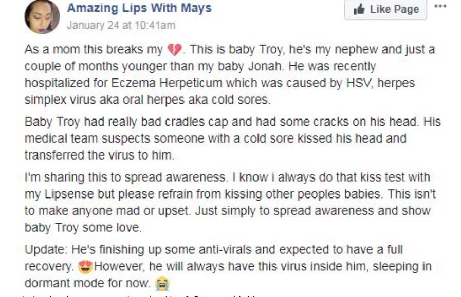 Un bacio a un bebè è una delle cose più innocenti del mondo, purtroppo le conseguenze sul nipote di Mays Vue, blogger di bellezza e cosmetici, sono state drammatiche.