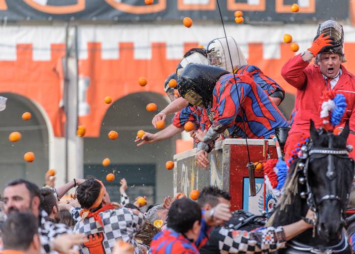 Famoso anche per la Battaglia delle Arance, per tre pomeriggi – da Domenica a Martedì Grasso – le squadre a piedi combattono contro gli aranceri sui carri, protetti da maschere di cuoio. Chi poi non indossa il Berretto Frigio dal giovedì grasso può essere colpito dagli aranceri nelle zone di battaglia.