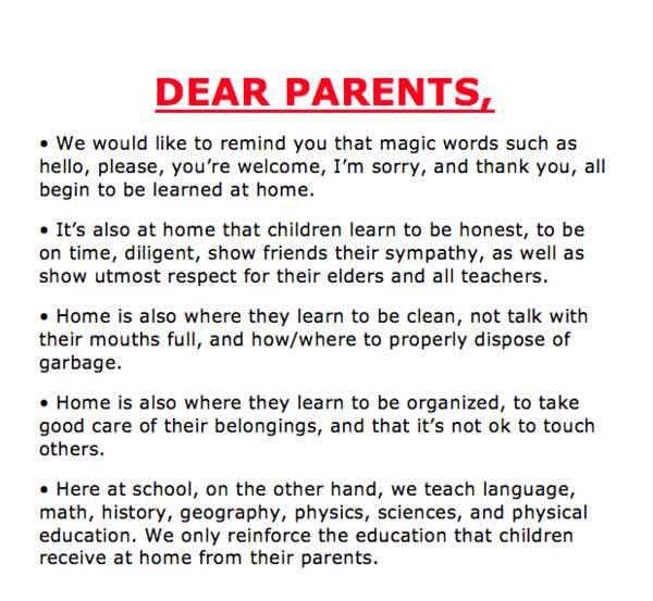 Si tratta di poche e semplice righe – cinque punti per la precisione – che parlano del ruolo dei genitori, un ruolo così importante che influisce anche nel comportamento dei bambini a scuola.