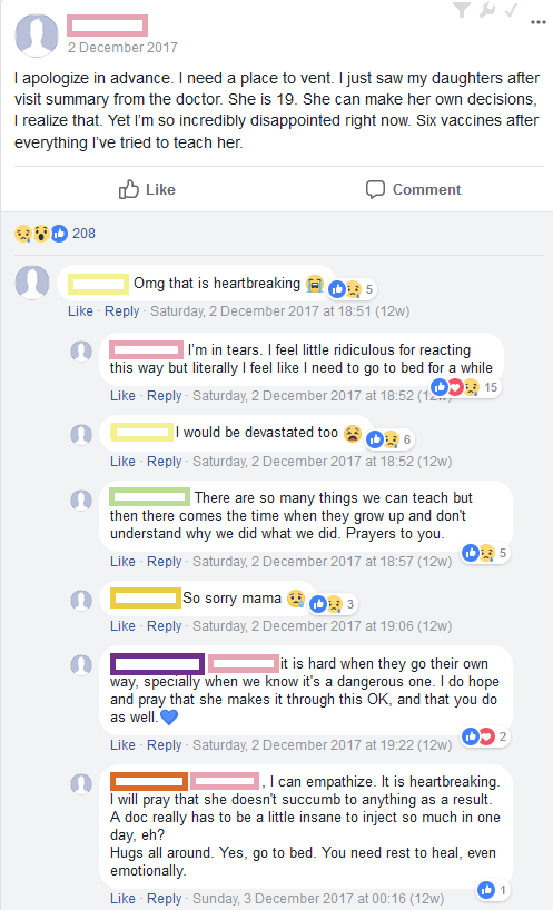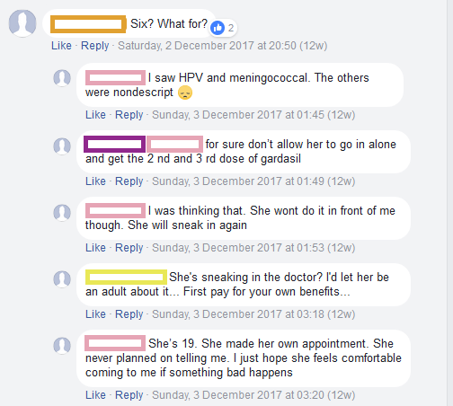 A che le chiede per quali malattie la figlia si sia vaccinata, la mamma no-vax risponde, con la emoj affranta: HPV e menigococco. Le altre non le conosce. C’è chi consiglia alla donna di non permettere alla figlia di fare i richiami del vaccino per l’HPV, il Gardasil. La madre approva, affermando che per fare il richiamo la figlia dovrà sgattaiolare via alle sue spalle. La donna comunque si augura che la figlia si senta a suo agio nel rivolgersi a lei se dovesse accadere qualcosa di brutto.
